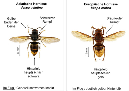 Die Asiatische Hornisse ist ein Bienenschädling, der sich in Europa und inzwischen auch in der Schweiz rasch ausbreitet. Das Insekt baut seine Primärnester geschützt in der Nähe von Häusern und die Sekundärnester hoch oben in Baumkronen. Asiatische Hornissen jagen Insekten wie Honigbienen, Wildbienen und weitere Insekten, um ihre Larven zu ernähren. Sie sind am dunklen Hinterleib (mit feinen gelben Streifen) und den gelben Beinenden zu erkennen.