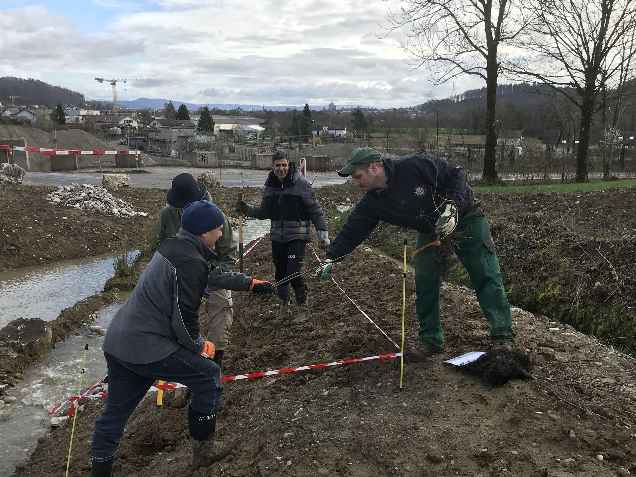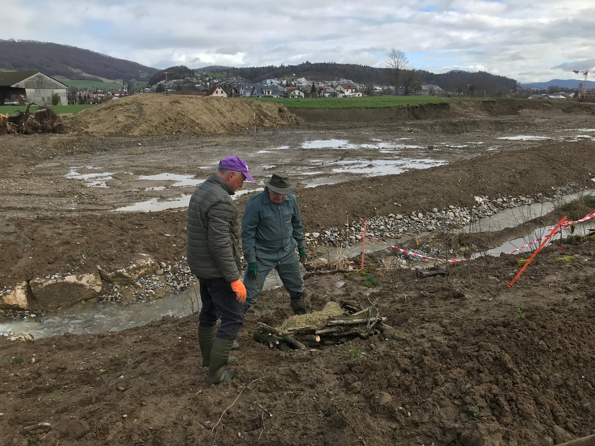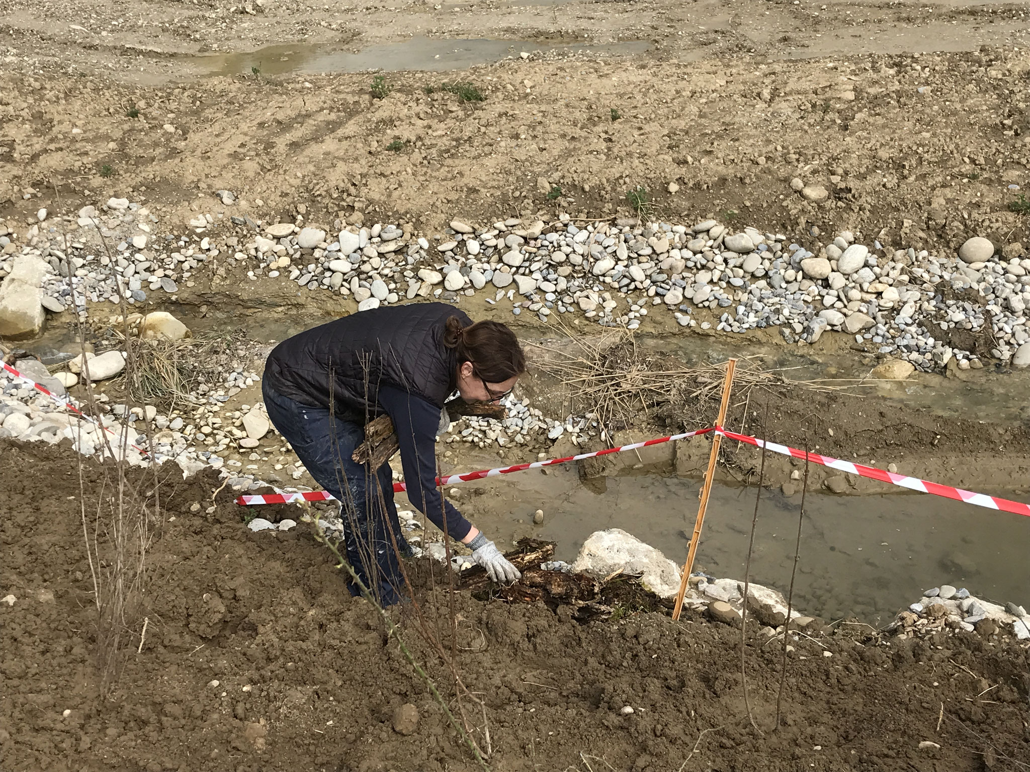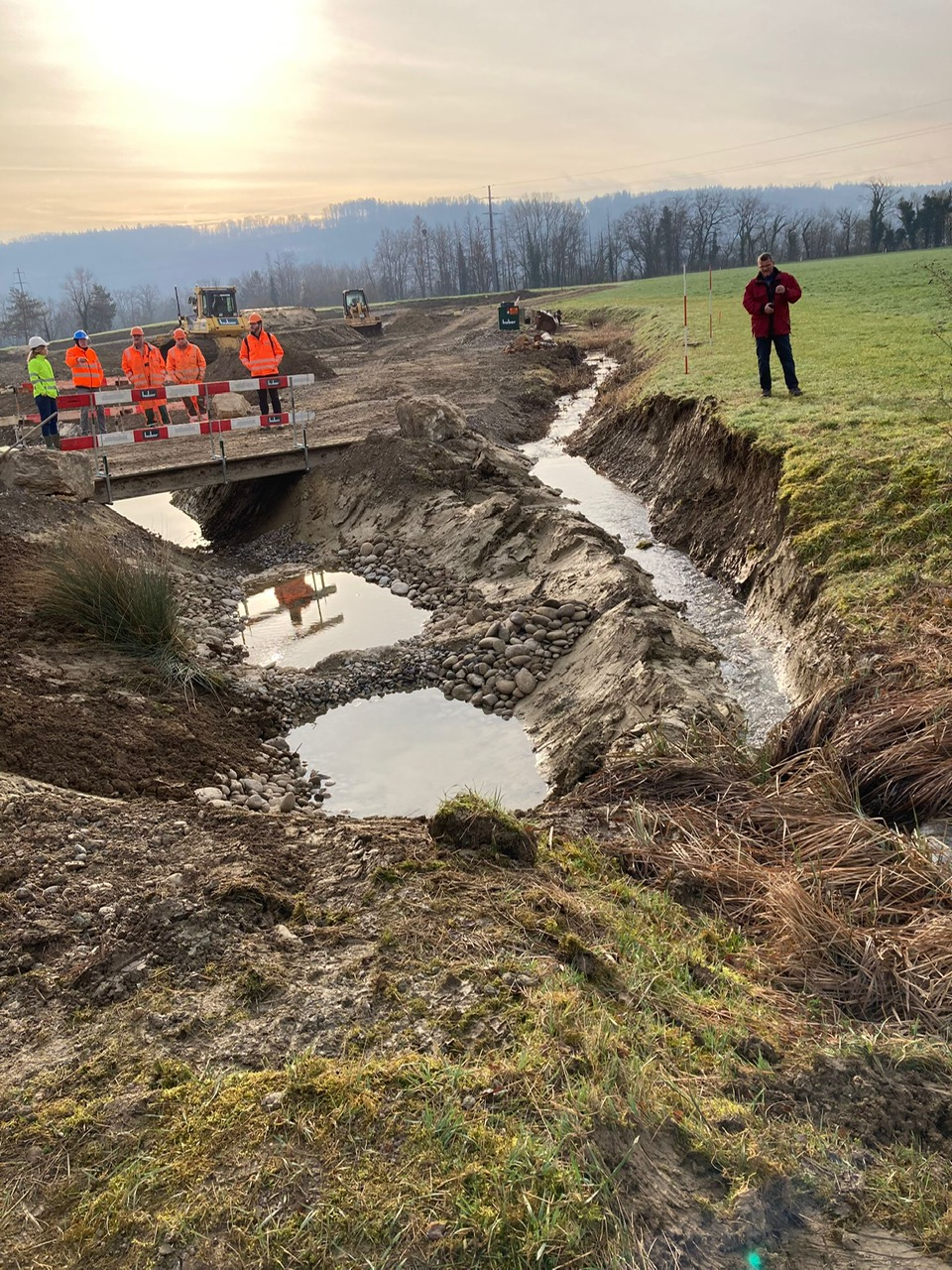 In einer ersten Etappe erhielt das Brunnbächli Anfang 2024 ein neues naturnah gestaltetes Bachbett. Auf der Ruderalfläche wurde aus lehmigem Aushubma-terial ein temporäres Pioniergewässer erstellt. Im März haben 15 Freiwillige und fünf Kinder insgesamt 240 einheimische Gehölze in die Uferböschung gepflanzt und zusätzliche Kleinstrukturen errichtet. Aus der alten Öko-Ausgleichsfläche bargen wir drei Abende lang wertvolles Moderholz und Moos, auch Unken, eine Erdkröte, Bergmolche und Leuchtkäfer-Larven und siedelten sie um in die neue Bachböschung. Auch aus dem alten Bachbett wurden Wasser- und Uferpflanzen ausgegraben und ins neue Bachbett hinübergerettet. Während der Bauarbeiten wurden weitere 17 Unken und 7 Mauereidechsen eingefangen und in einem Häckselhaufen in Sicherheit gebracht.