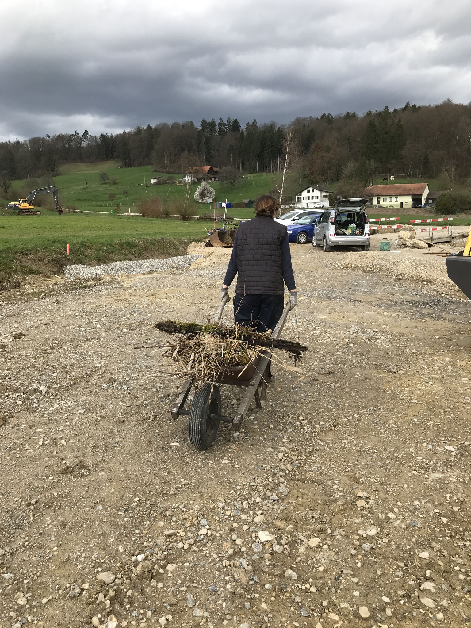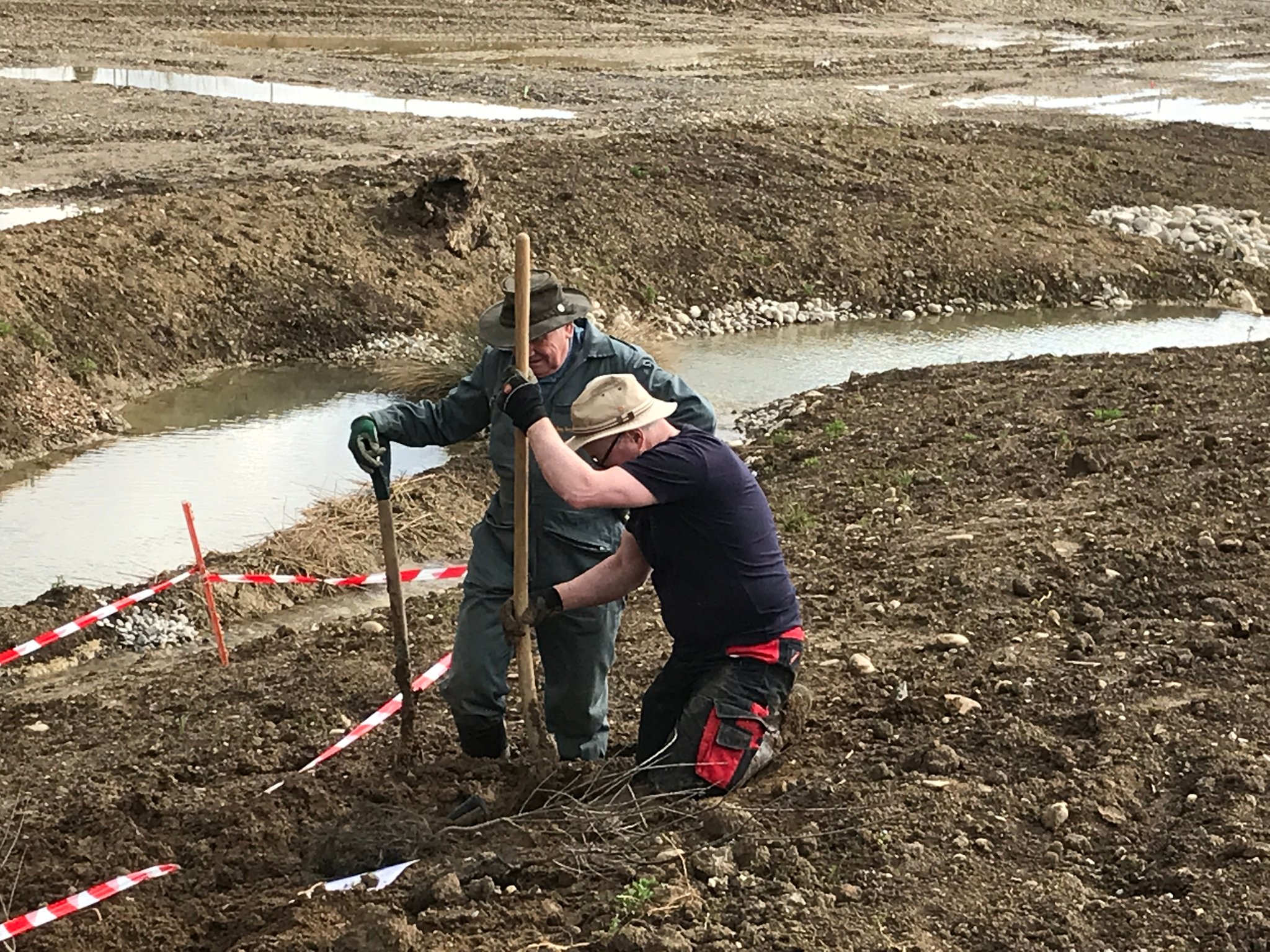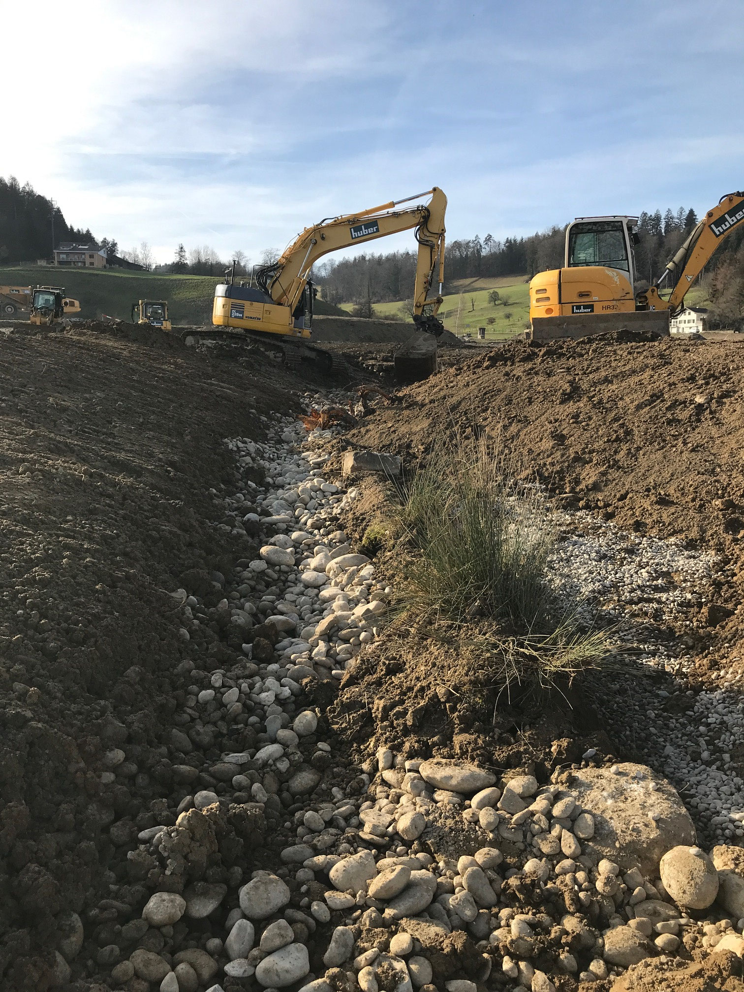 In einer ersten Etappe erhielt das Brunnbächli Anfang 2024 ein neues naturnah gestaltetes Bachbett. Auf der Ruderalfläche wurde aus lehmigem Aushubma-terial ein temporäres Pioniergewässer erstellt. Im März haben 15 Freiwillige und fünf Kinder insgesamt 240 einheimische Gehölze in die Uferböschung gepflanzt und zusätzliche Kleinstrukturen errichtet. Aus der alten Öko-Ausgleichsfläche bargen wir drei Abende lang wertvolles Moderholz und Moos, auch Unken, eine Erdkröte, Bergmolche und Leuchtkäfer-Larven und siedelten sie um in die neue Bachböschung. Auch aus dem alten Bachbett wurden Wasser- und Uferpflanzen ausgegraben und ins neue Bachbett hinübergerettet. Während der Bauarbeiten wurden weitere 17 Unken und 7 Mauereidechsen eingefangen und in einem Häckselhaufen in Sicherheit gebracht.