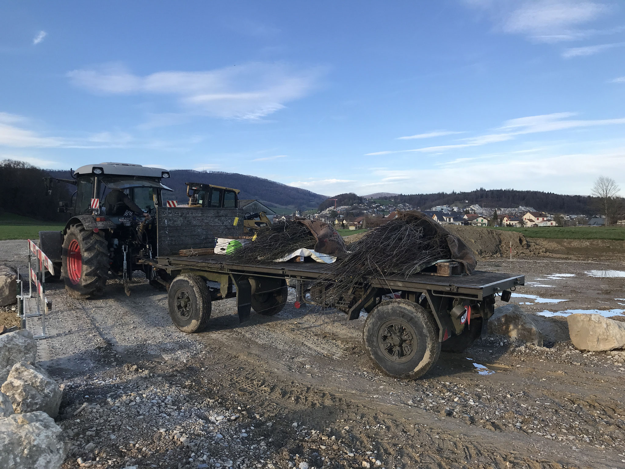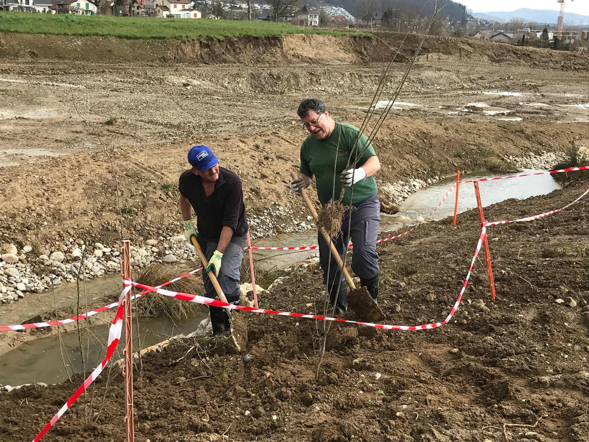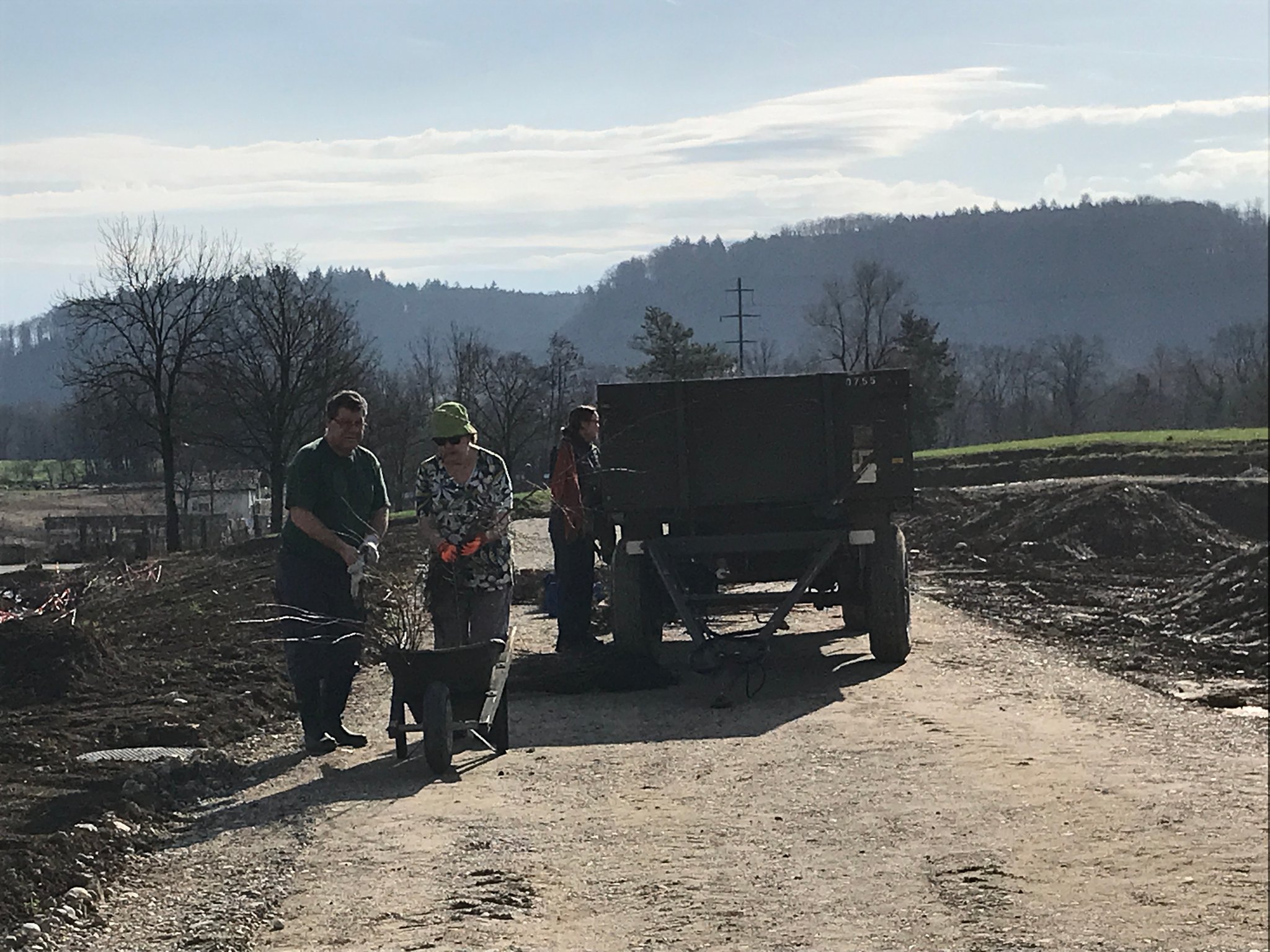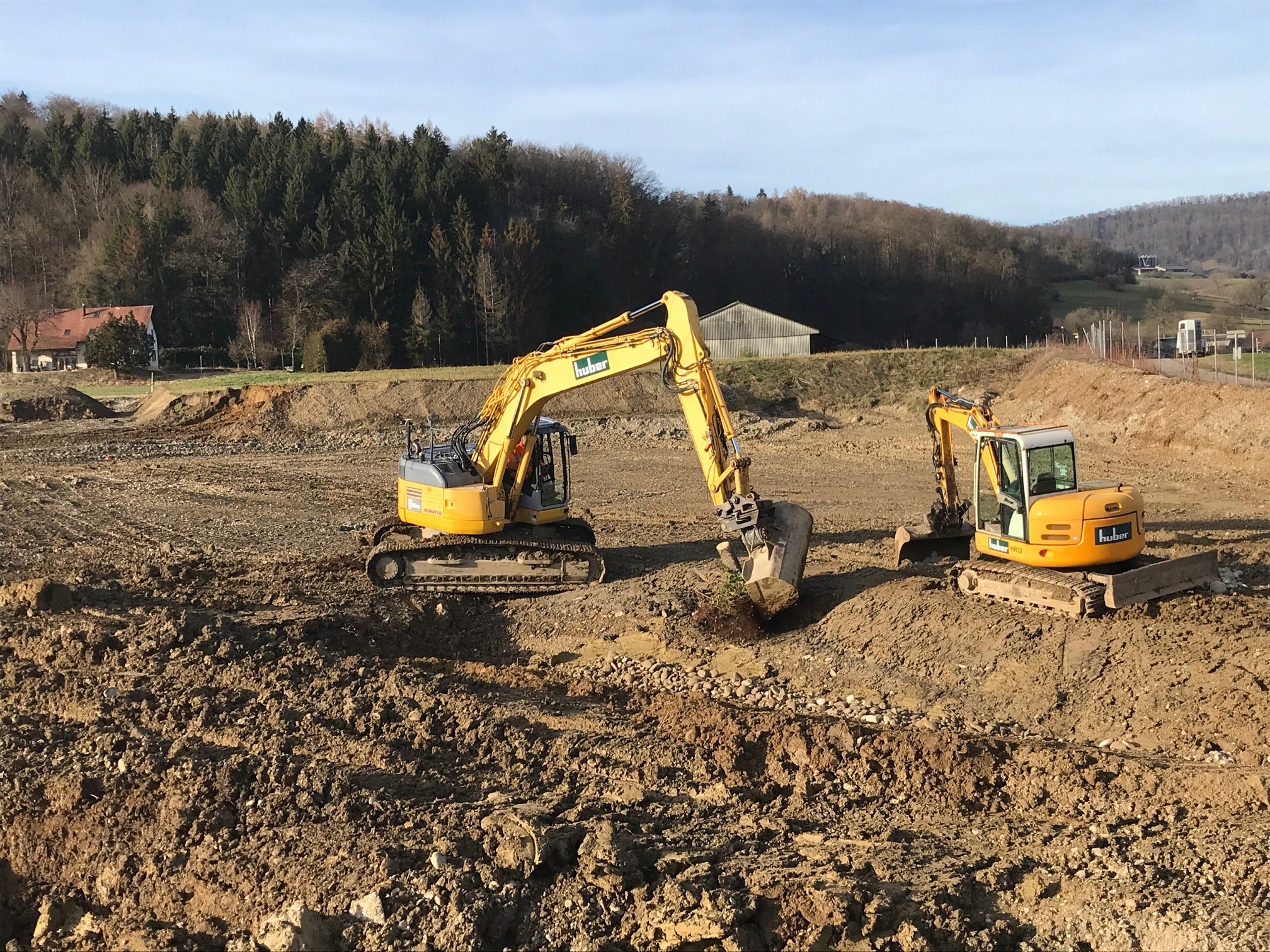 In einer ersten Etappe erhielt das Brunnbächli Anfang 2024 ein neues naturnah gestaltetes Bachbett. Auf der Ruderalfläche wurde aus lehmigem Aushubma-terial ein temporäres Pioniergewässer erstellt. Im März haben 15 Freiwillige und fünf Kinder insgesamt 240 einheimische Gehölze in die Uferböschung gepflanzt und zusätzliche Kleinstrukturen errichtet. Aus der alten Öko-Ausgleichsfläche bargen wir drei Abende lang wertvolles Moderholz und Moos, auch Unken, eine Erdkröte, Bergmolche und Leuchtkäfer-Larven und siedelten sie um in die neue Bachböschung. Auch aus dem alten Bachbett wurden Wasser- und Uferpflanzen ausgegraben und ins neue Bachbett hinübergerettet. Während der Bauarbeiten wurden weitere 17 Unken und 7 Mauereidechsen eingefangen und in einem Häckselhaufen in Sicherheit gebracht.
