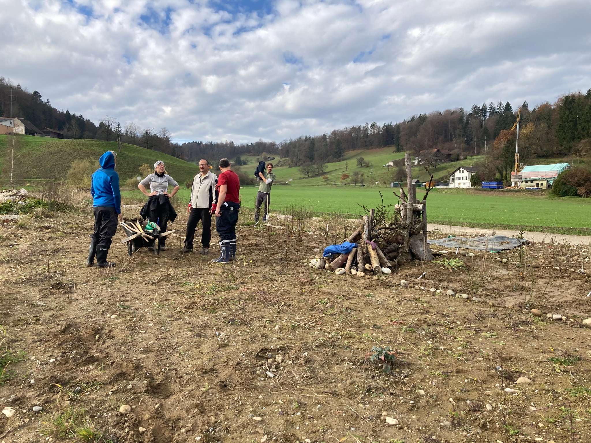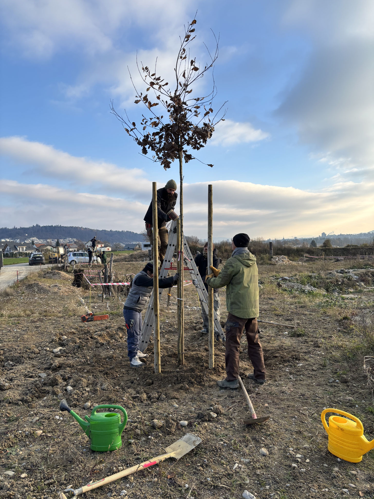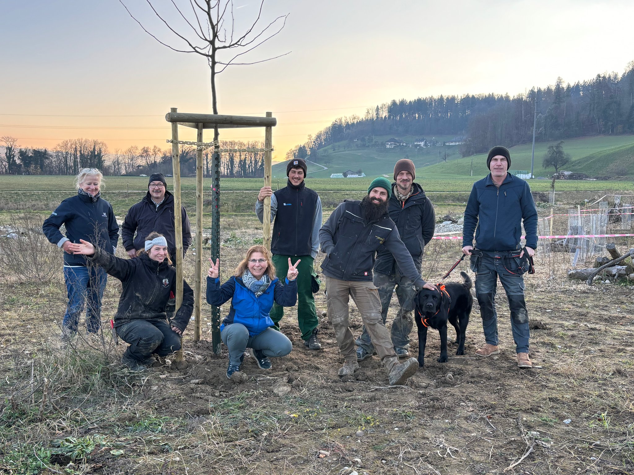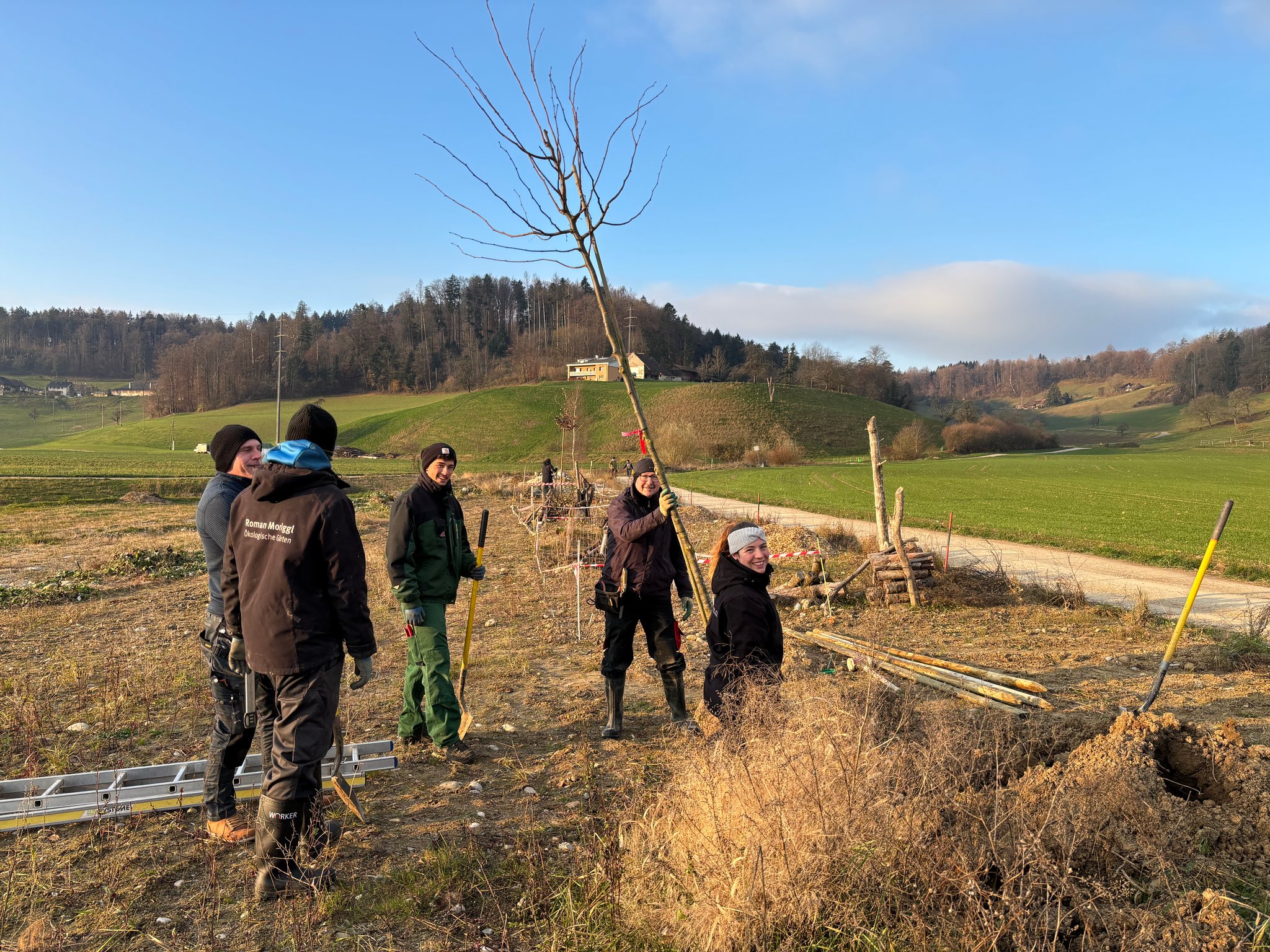Eine Woche später, am 22. November, fanden sich 12 Helfer ein, und wiederum durften wir auf die angehenden Profis vom Moriggl Ökogarten AG, Salamander Naturgarten AG, Haring und Partner Gartenbau AG, Flury Gartenbau AG, Belke Gartenbau AG und David Gartenbau AG zählen. Auch die Werkzeuge und ein Fahrzeug wurden von Moriggl Ökogarten AG zur Verfügung gestellt. Souverän pflanzten sie unsere Solitärbäume, auf die wir uns schon seit langem gefreut hatten: Eine grosse Winterlinde zu Ehren unseres verstorbenen Vorstands-mitglieds Edy Kaiser, in Zukunft Kaiserlinde genannt, und eine Traubeneiche, welche von unserem langjährigen ehemaligen Vereinspräsidenten und Ehrenmitglied Bernd Rothacher gespendet wurde. Auch eine Elsbeere und ein Speierling wurden gepflanzt. Auf der Magerwiese südlich des Brunnbächli fanden fünf Apfelbäume, alles Pro Specie Rara Arten, ihren Bestimmungsort. Sie werden die Landschaft mit ihrer Erscheinung bereichern und die