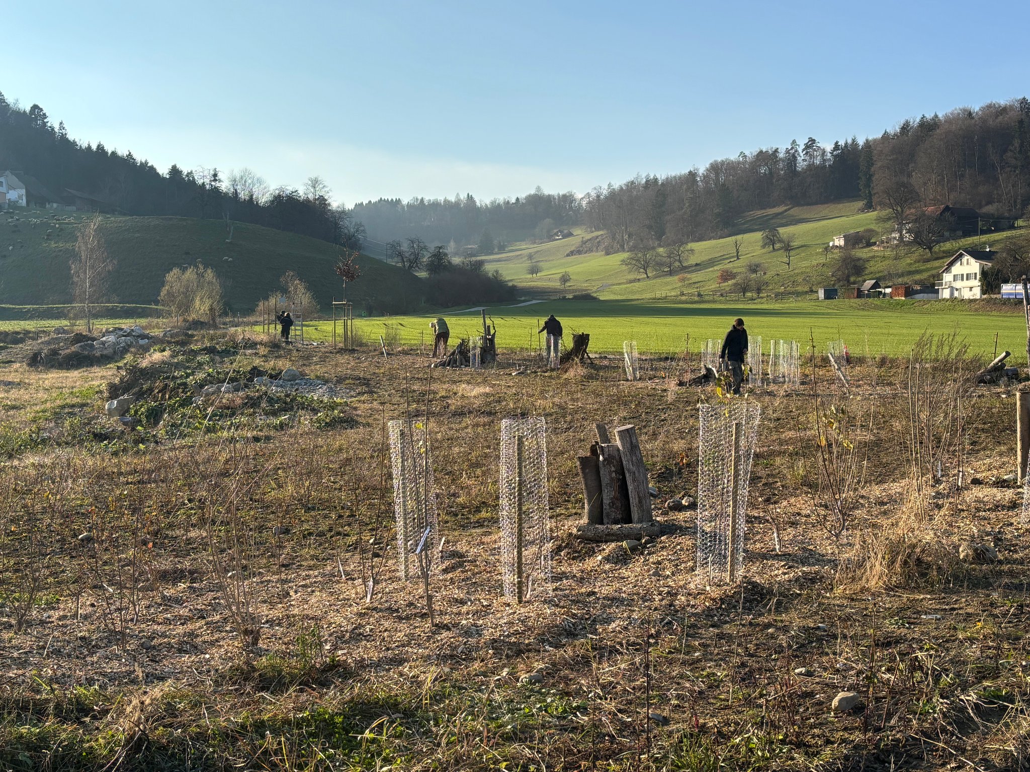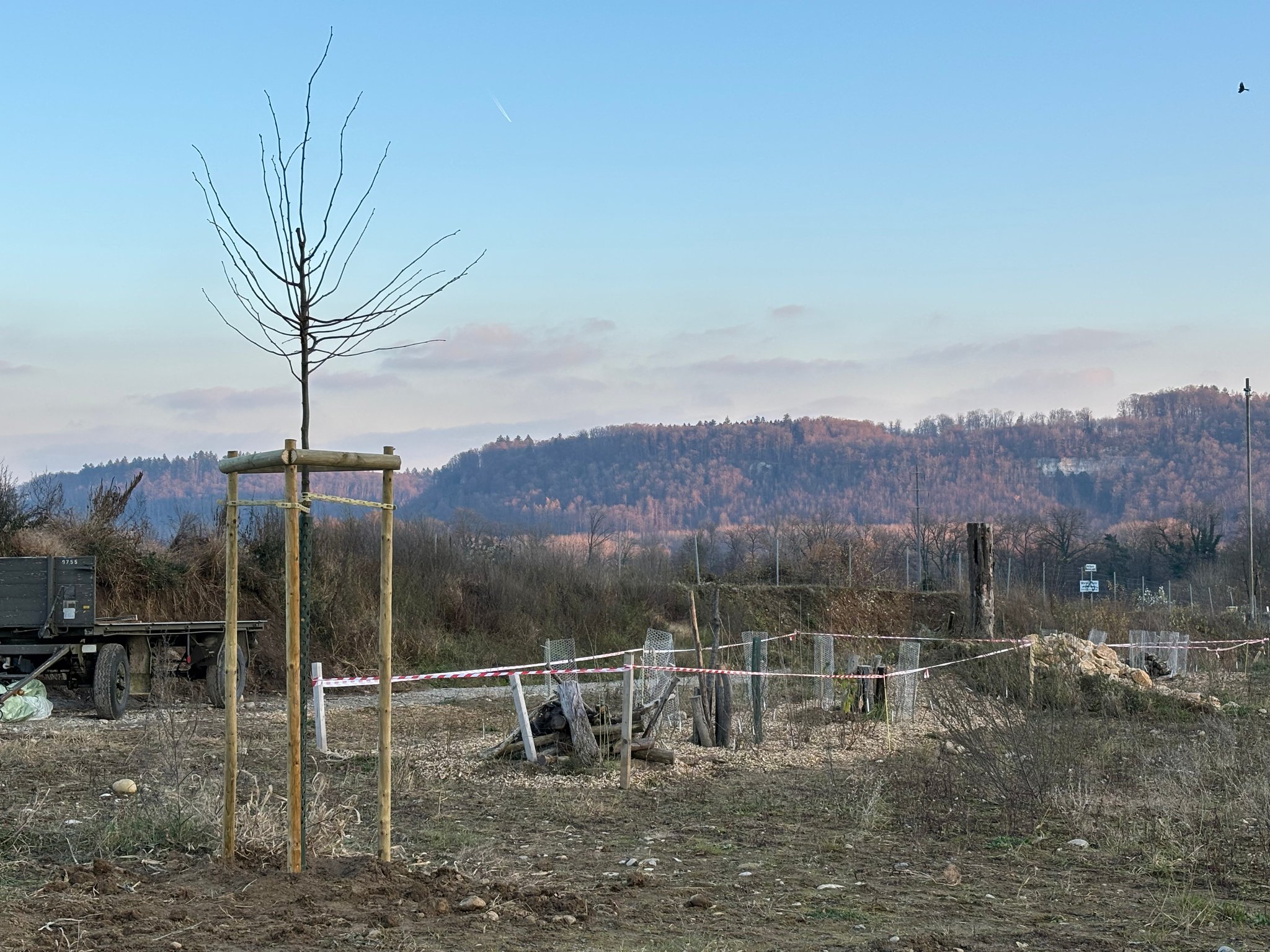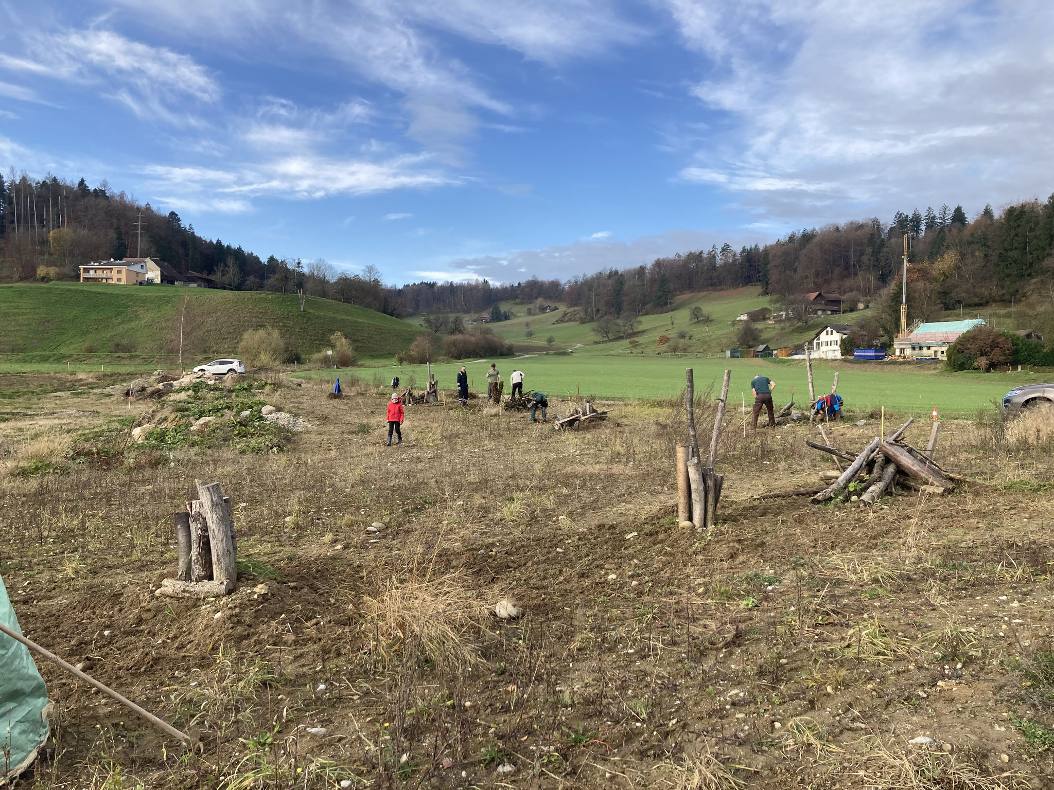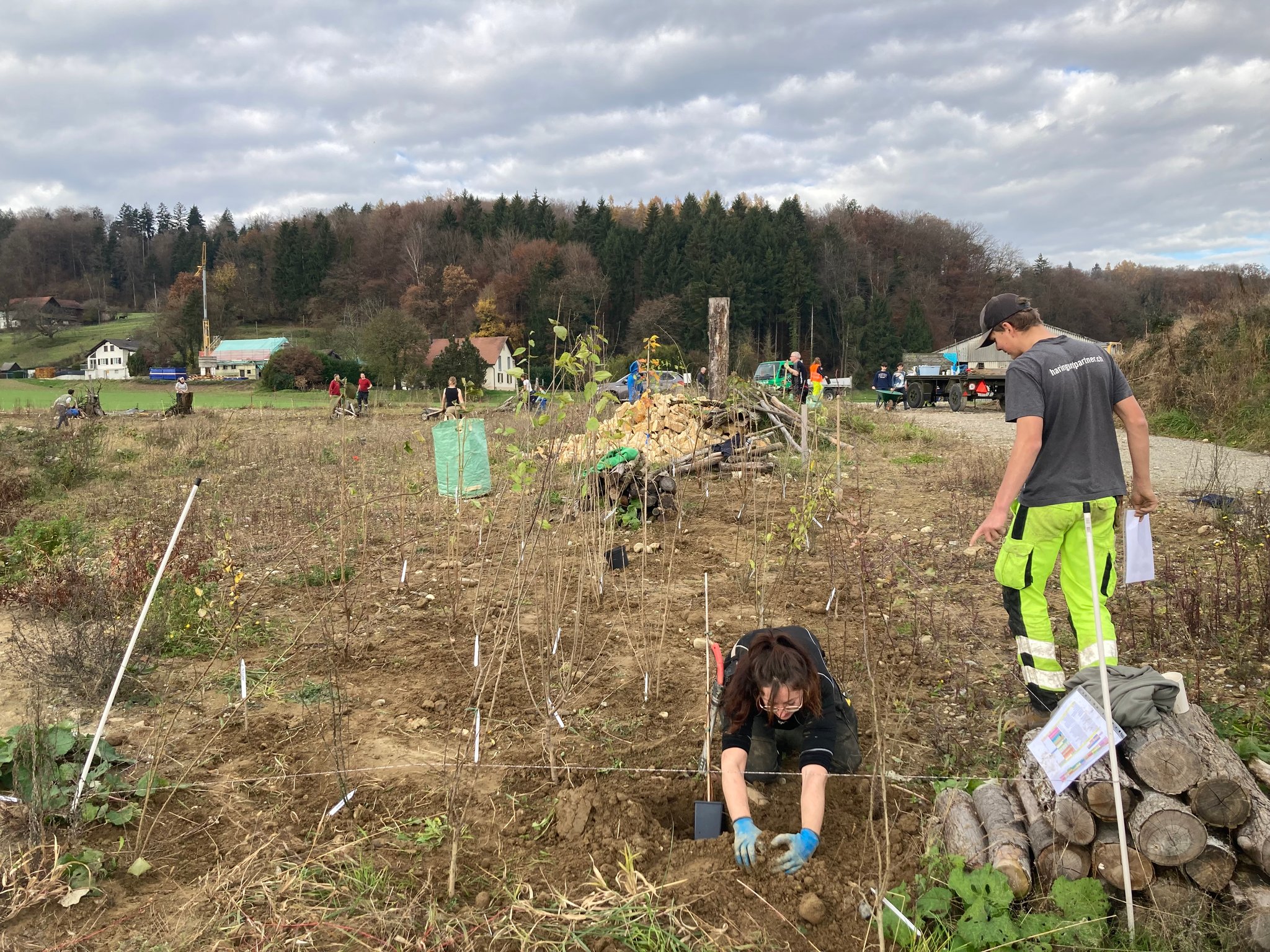 Eine Woche später, am 22. November, fanden sich 12 Helfer ein, und wiederum durften wir auf die angehenden Profis vom Moriggl Ökogarten AG, Salamander Naturgarten AG, Haring und Partner Gartenbau AG, Flury Gartenbau AG, Belke Gartenbau AG und David Gartenbau AG zählen. Auch die Werkzeuge und ein Fahrzeug wurden von Moriggl Ökogarten AG zur Verfügung gestellt. Souverän pflanzten sie unsere Solitärbäume, auf die wir uns schon seit langem gefreut hatten: Eine grosse Winterlinde zu Ehren unseres verstorbenen Vorstands-mitglieds Edy Kaiser, in Zukunft Kaiserlinde genannt, und eine Traubeneiche, welche von unserem langjährigen ehemaligen Vereinspräsidenten und Ehrenmitglied Bernd Rothacher gespendet wurde. Auch eine Elsbeere und ein Speierling wurden gepflanzt. Auf der Magerwiese südlich des Brunnbächli fanden fünf Apfelbäume, alles Pro Specie Rara Arten, ihren Bestimmungsort. Sie werden die Landschaft mit ihrer Erscheinung bereichern und die