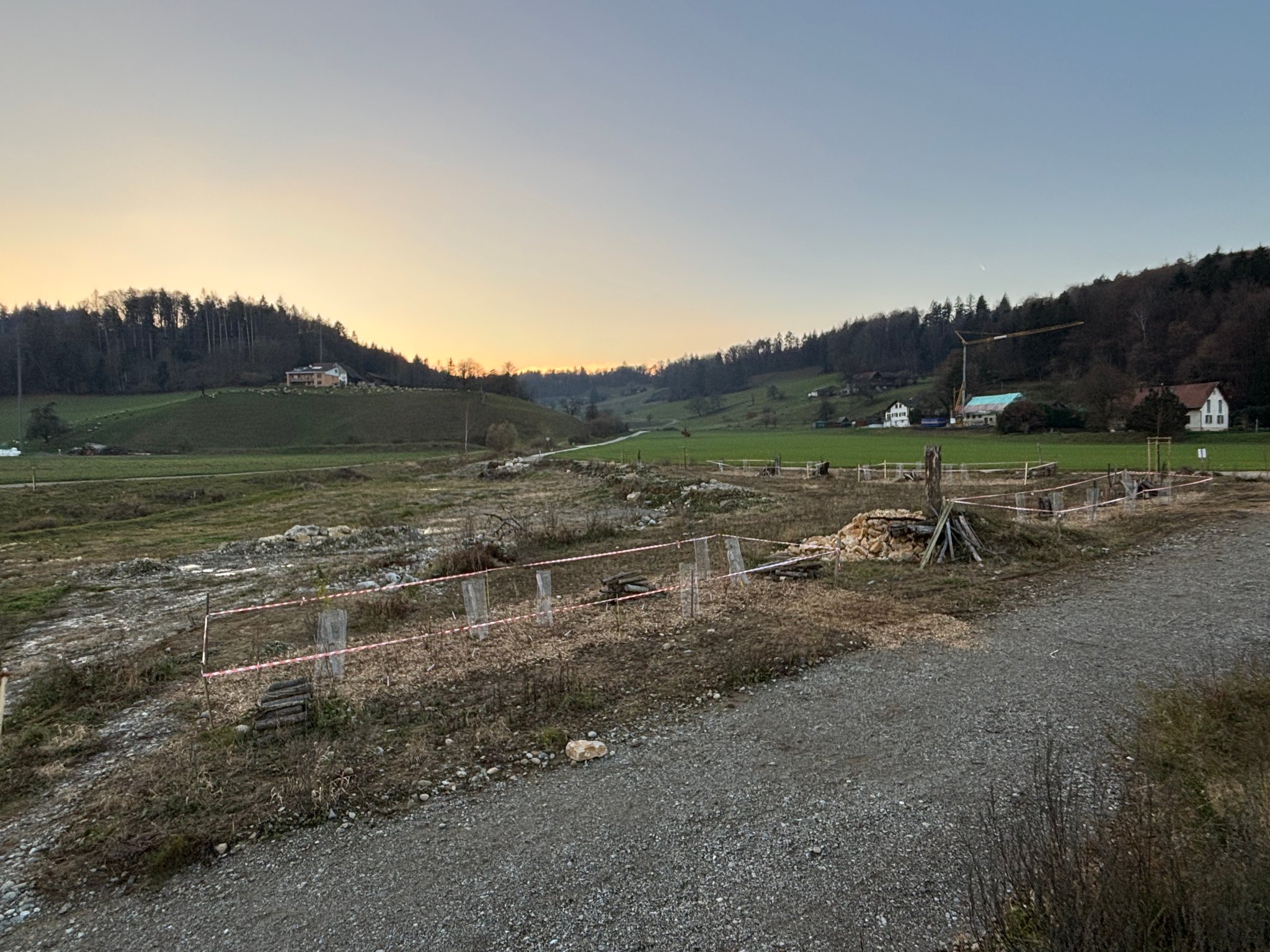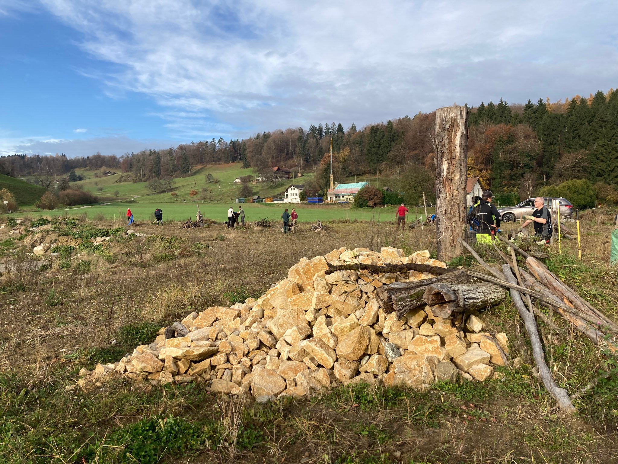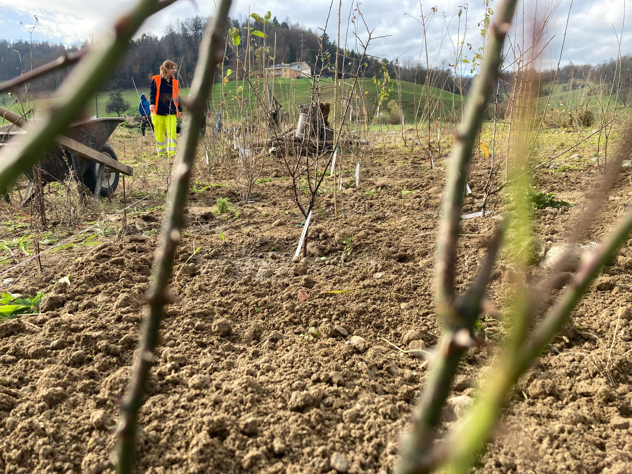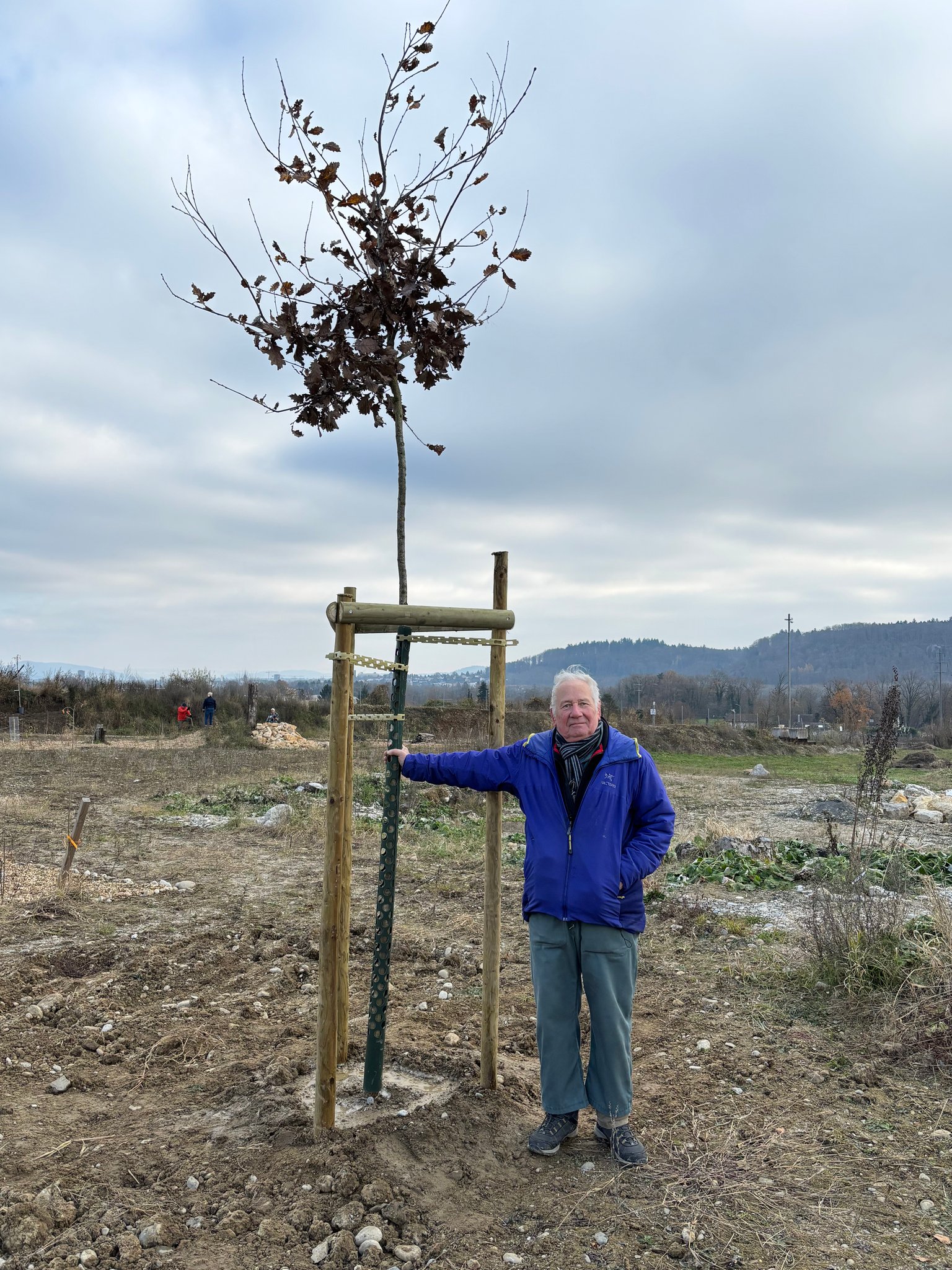 Eine Woche später, am 22. November, fanden sich 12 Helfer ein, und wiederum durften wir auf die angehenden Profis vom Moriggl Ökogarten AG, Salamander Naturgarten AG, Haring und Partner Gartenbau AG, Flury Gartenbau AG, Belke Gartenbau AG und David Gartenbau AG zählen. Auch die Werkzeuge und ein Fahrzeug wurden von Moriggl Ökogarten AG zur Verfügung gestellt. Souverän pflanzten sie unsere Solitärbäume, auf die wir uns schon seit langem gefreut hatten: Eine grosse Winterlinde zu Ehren unseres verstorbenen Vorstands-mitglieds Edy Kaiser, in Zukunft Kaiserlinde genannt, und eine Traubeneiche, welche von unserem langjährigen ehemaligen Vereinspräsidenten und Ehrenmitglied Bernd Rothacher gespendet wurde. Auch eine Elsbeere und ein Speierling wurden gepflanzt. Auf der Magerwiese südlich des Brunnbächli fanden fünf Apfelbäume, alles Pro Specie Rara Arten, ihren Bestimmungsort. Sie werden die Landschaft mit ihrer Erscheinung bereichern und die