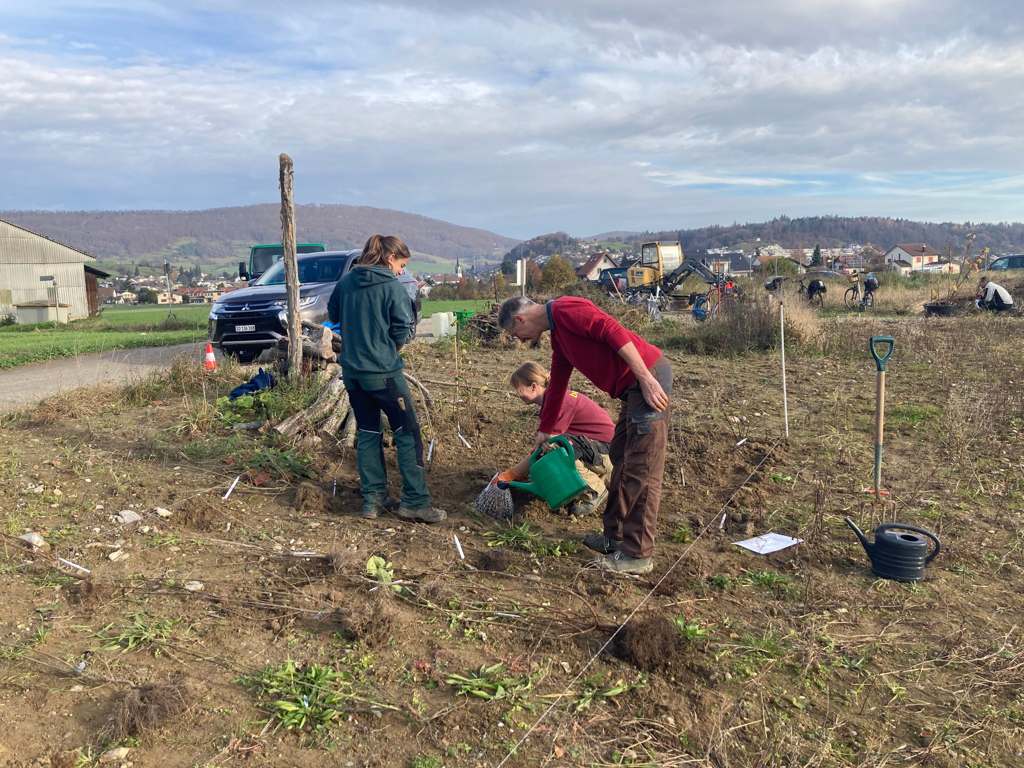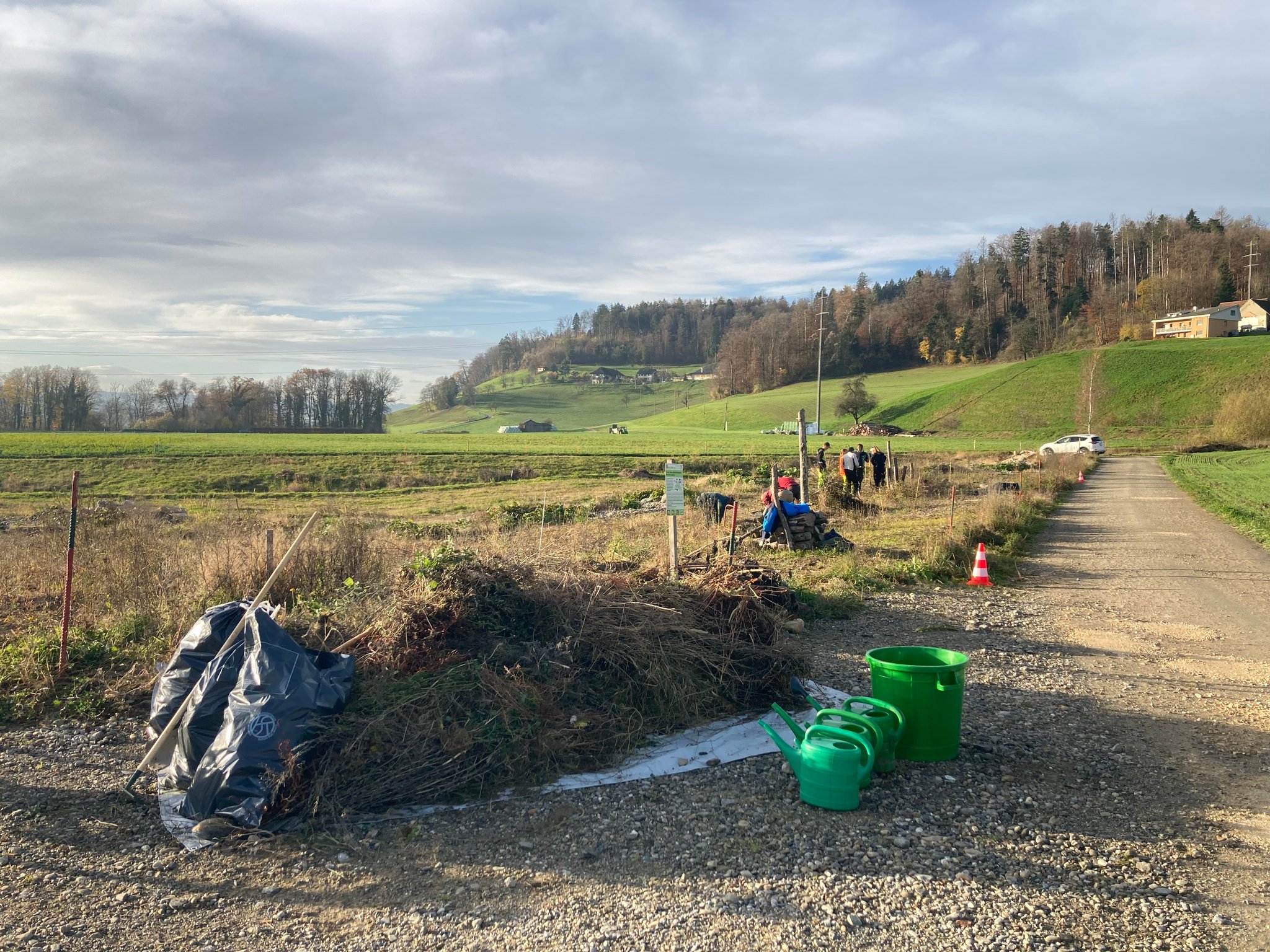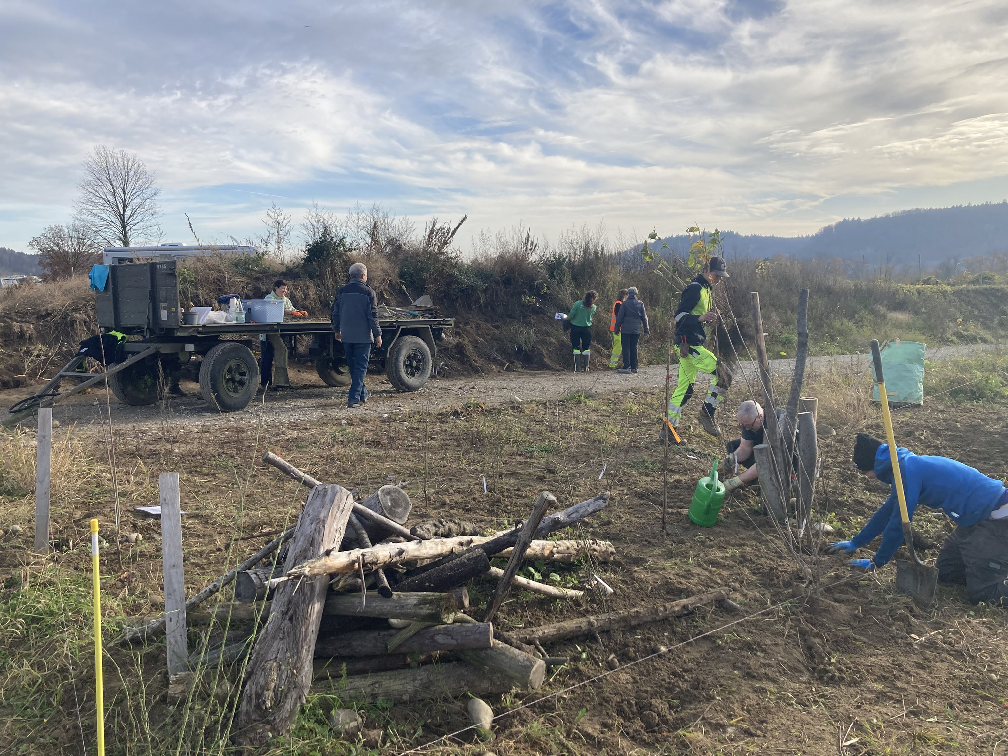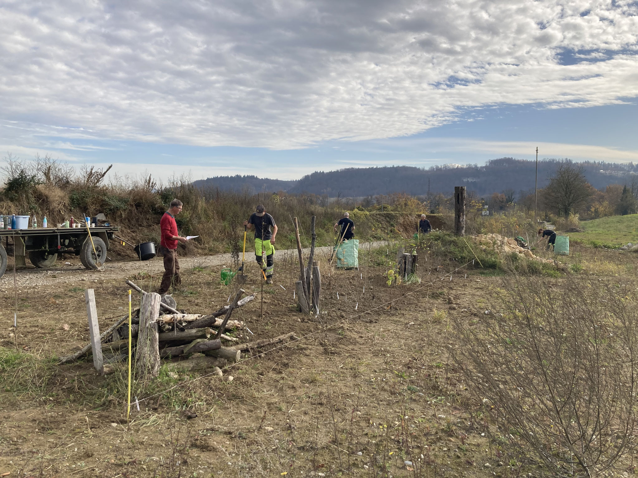 Am 15. November 2025 wurden im Naturschutzgebiet Birch-Brunnacker wie geplant die einheimischen Hecken, insgesamt 251 Gehölze, gepflanzt. Das Wetter blieb zum Glück trocken und es war auch angenehm warm. Dank einer sehr grossen Helfer-Schar von 17 Erwachsenen, darunter viele Lehrlinge aus umliegenden Gartenbaubetrieben, und fünf Kindern lief alles wie am Schnürchen. Es gab allerdings viel zu tun: So mussten die in Erde eingeschlagenen Gehölze erst korrekt sortiert und angeschrieben werden. Unterdessen wurden die Pflanzbereiche gejätet und dann erst ging es ans Auslegen der Pflanzen und schliesslich ans Eingraben und Angiessen. Einige Gehölze wie Wildbirne und Holzapfel wurden festgebunden. Zum Mittagessen liessen wir uns im Restaurant Schmitte bedienen.