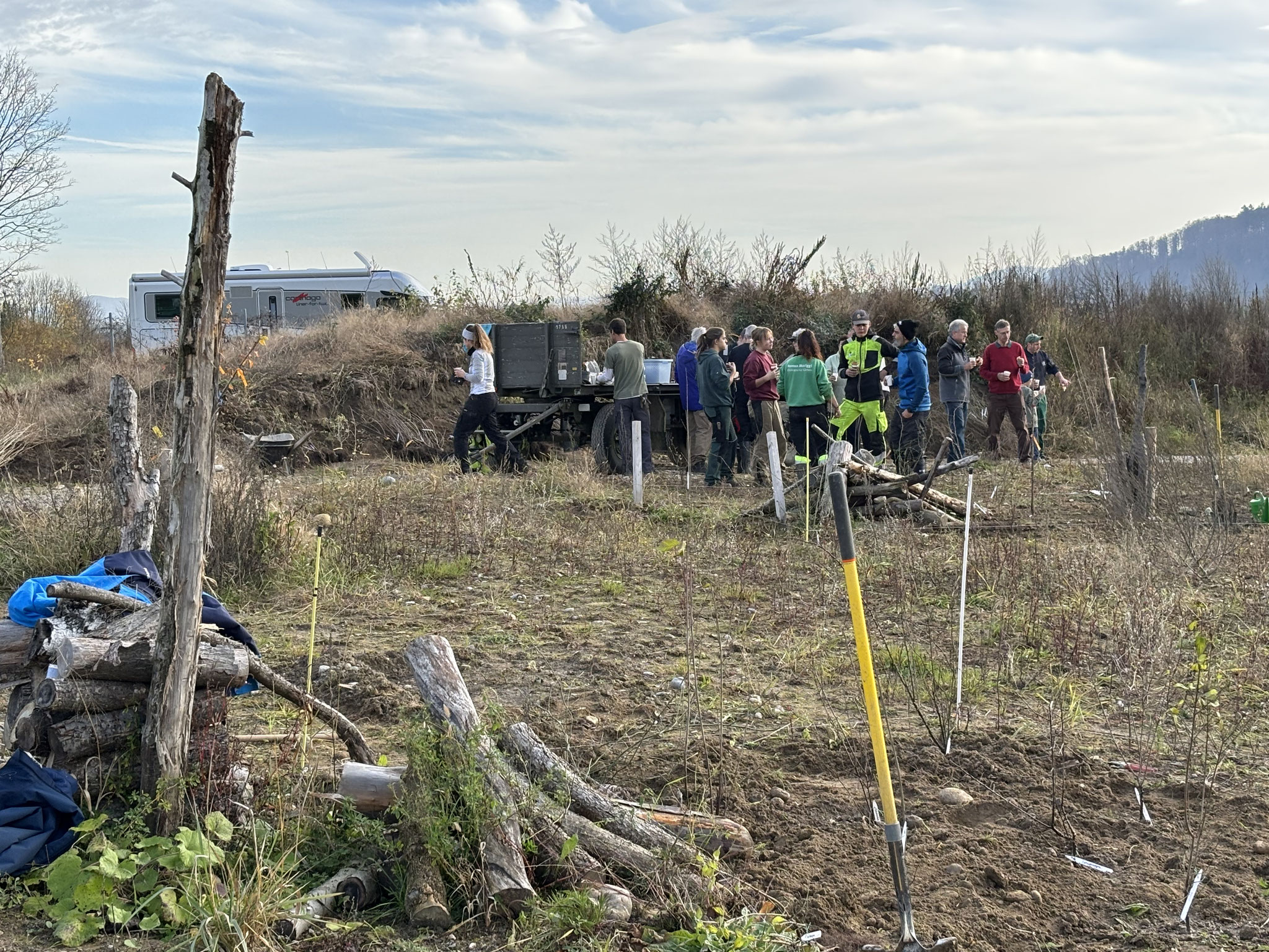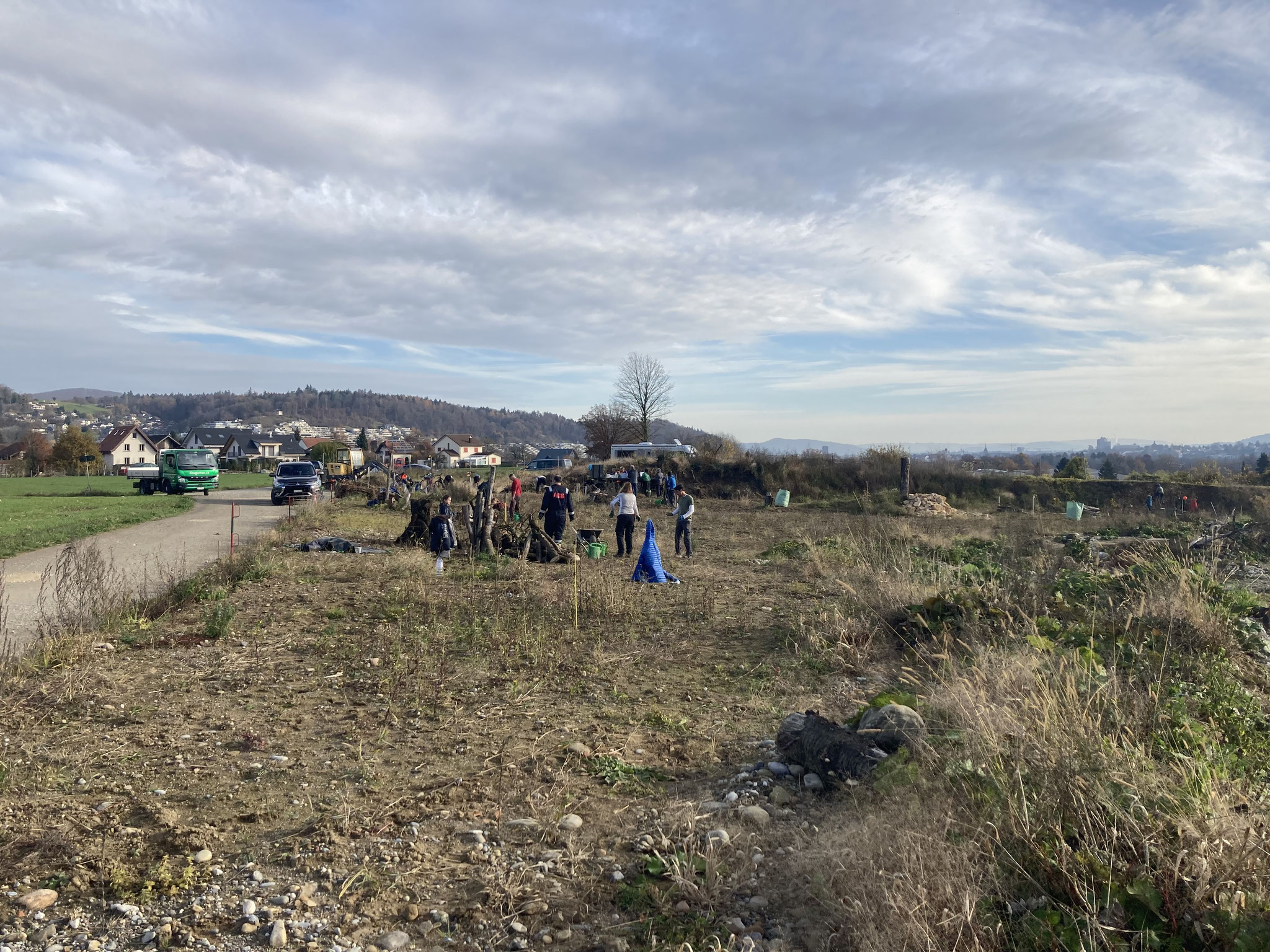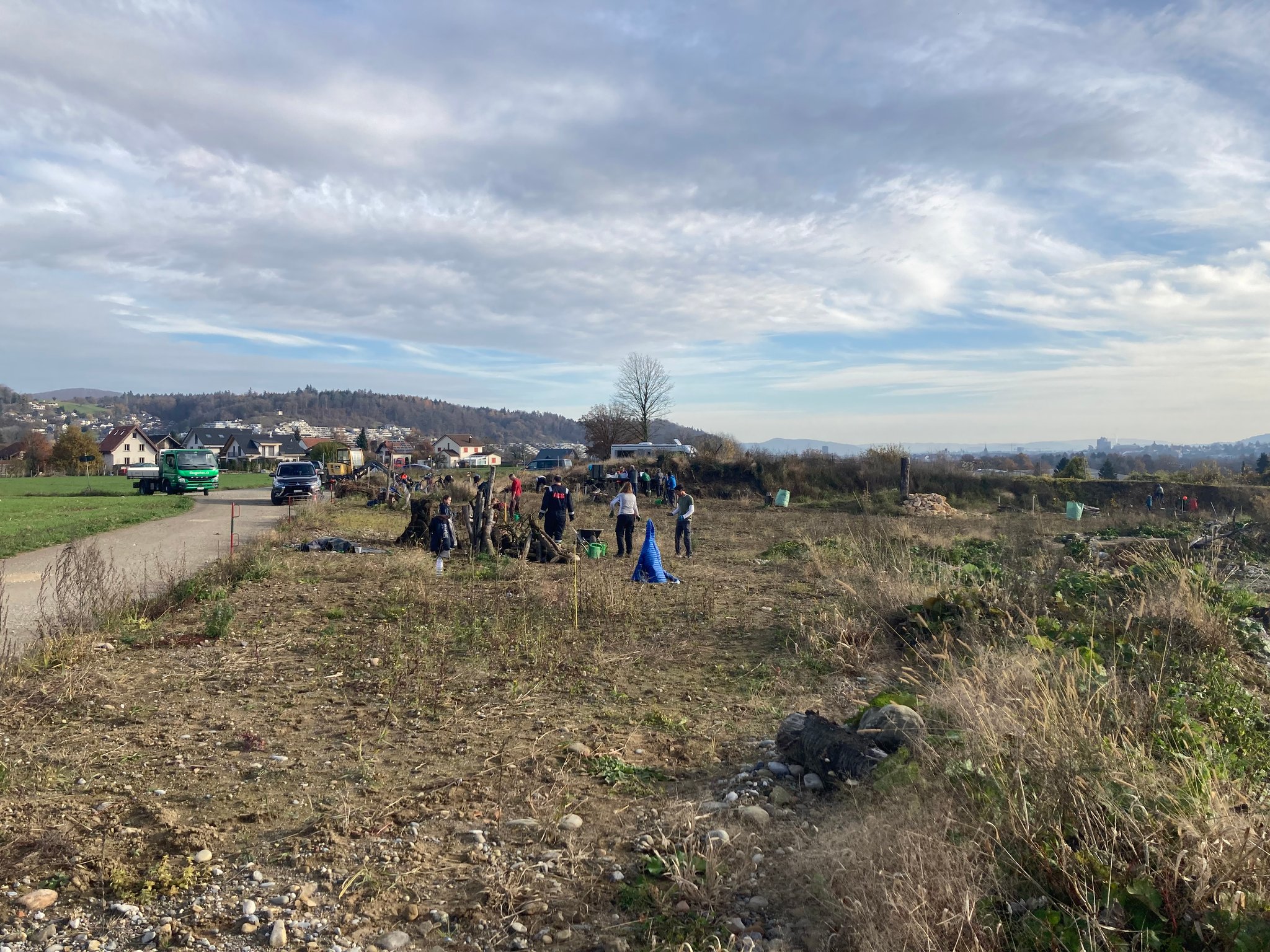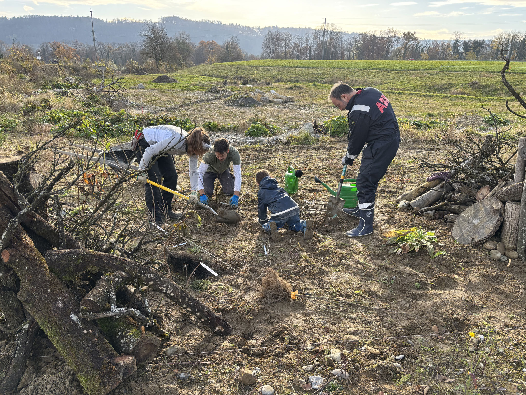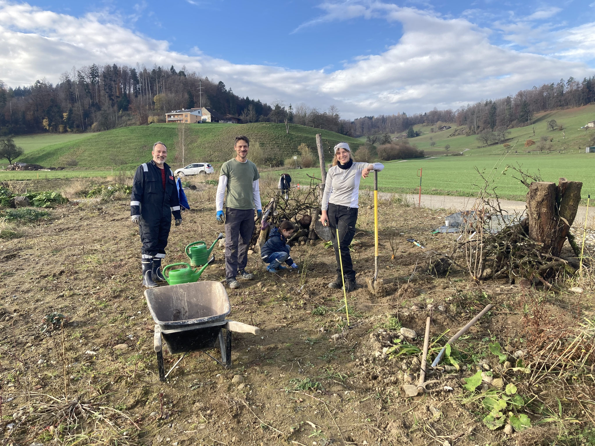 Am 15. November 2025 wurden im Naturschutzgebiet Birch-Brunnacker wie geplant die einheimischen Hecken, insgesamt 251 Gehölze, gepflanzt. Das Wetter blieb zum Glück trocken und es war auch angenehm warm. Dank einer sehr grossen Helfer-Schar von 17 Erwachsenen, darunter viele Lehrlinge aus umliegenden Gartenbaubetrieben, und fünf Kindern lief alles wie am Schnürchen. Es gab allerdings viel zu tun: So mussten die in Erde eingeschlagenen Gehölze erst korrekt sortiert und angeschrieben werden. Unterdessen wurden die Pflanzbereiche gejätet und dann erst ging es ans Auslegen der Pflanzen und schliesslich ans Eingraben und Angiessen. Einige Gehölze wie Wildbirne und Holzapfel wurden festgebunden. Zum Mittagessen liessen wir uns im Restaurant Schmitte bedienen.