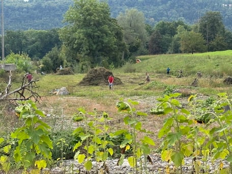 Am 6. September kamen bei schönstem Herbstwetter 9 Erwachsene und zwei Kinder zu Hilfe: Gemeinsam wurde das Schnittgut zu grossen Haufen zusammengerecht. Auch wurden dabei Weiden- und Pappelnschösslinge sowie Brombeeren ausgerissen und zurückgeschnitten, und wie bei jedem Einsatz, invasive Neophyten ausgerissen und separat in Kehrichtsäcken entsorgt. Ein währschaftes Znüni half, die anstrengende Arbeit zu bewältigen. Bis in den Nachmittag wurde gearbeitet, es wurde heiss, und die Erde dampfte. Die beiden Kinder suchten und zählten viele junge Gelbbauchunken im Bachbett, auch Bergmolche und deren Larven waren zu finden. Am Schluss schnitten sich die Helfer noch einige Sonnenblumen ab, die sich beim Eggen in den Pneurillen klebend den Weg in die Erde gefunden haben. Es war eine rundum erfolgreiche, anstrengende, fröhliche und gelungene Aktion.